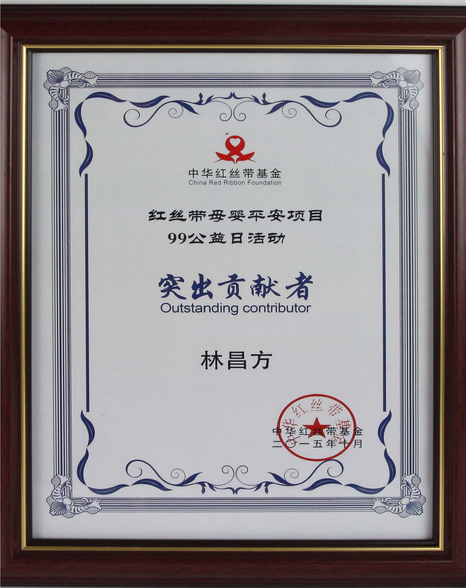 • 2015年10月獲得“中華紅絲帶基金突出貢獻(xiàn)者”